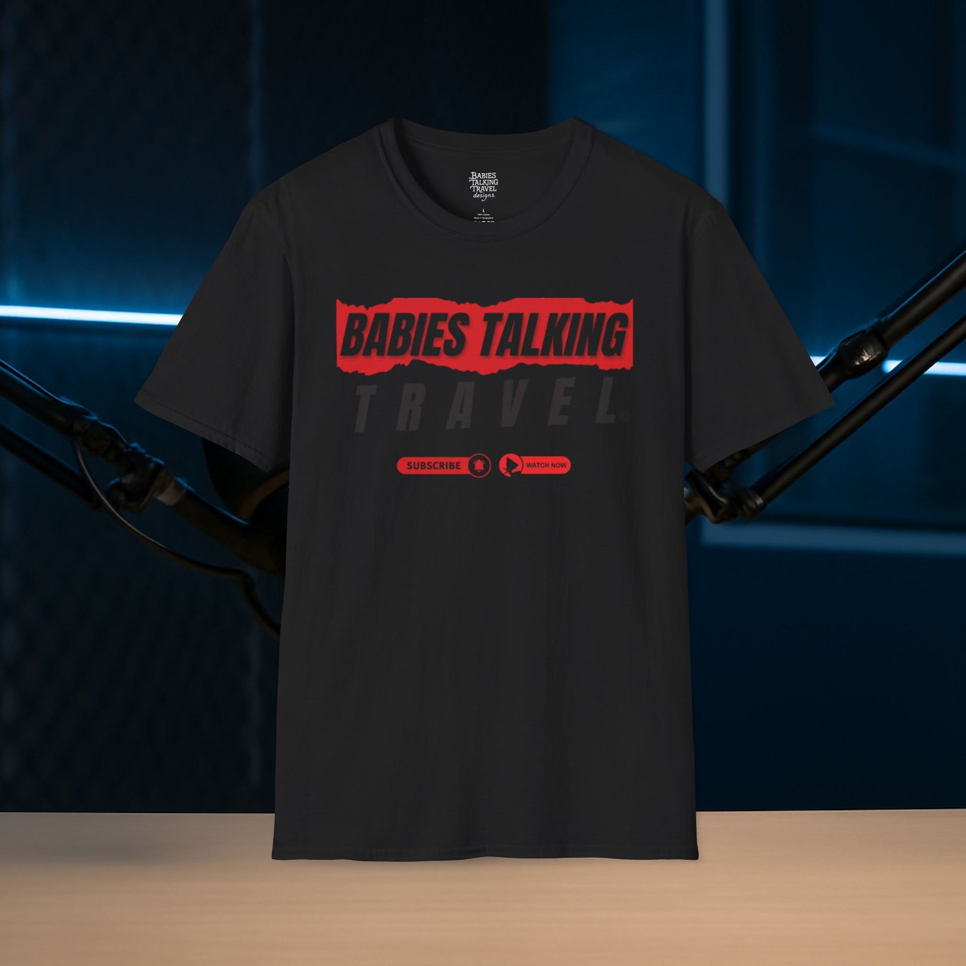 Show off your creative side with the Babies Talking Travel Logo - Dark mode Unisex Soft T-Shirt. Crafted from 100% ring-spun cotton, this lightweight tee (4.5 oz) offers all-day comfort and softness you’ll want to wear again and again. With its classic crew neckline and unisex fit, it’s versatile enough to pair with anything—whether you’re recording, editing, traveling, or just chilling.