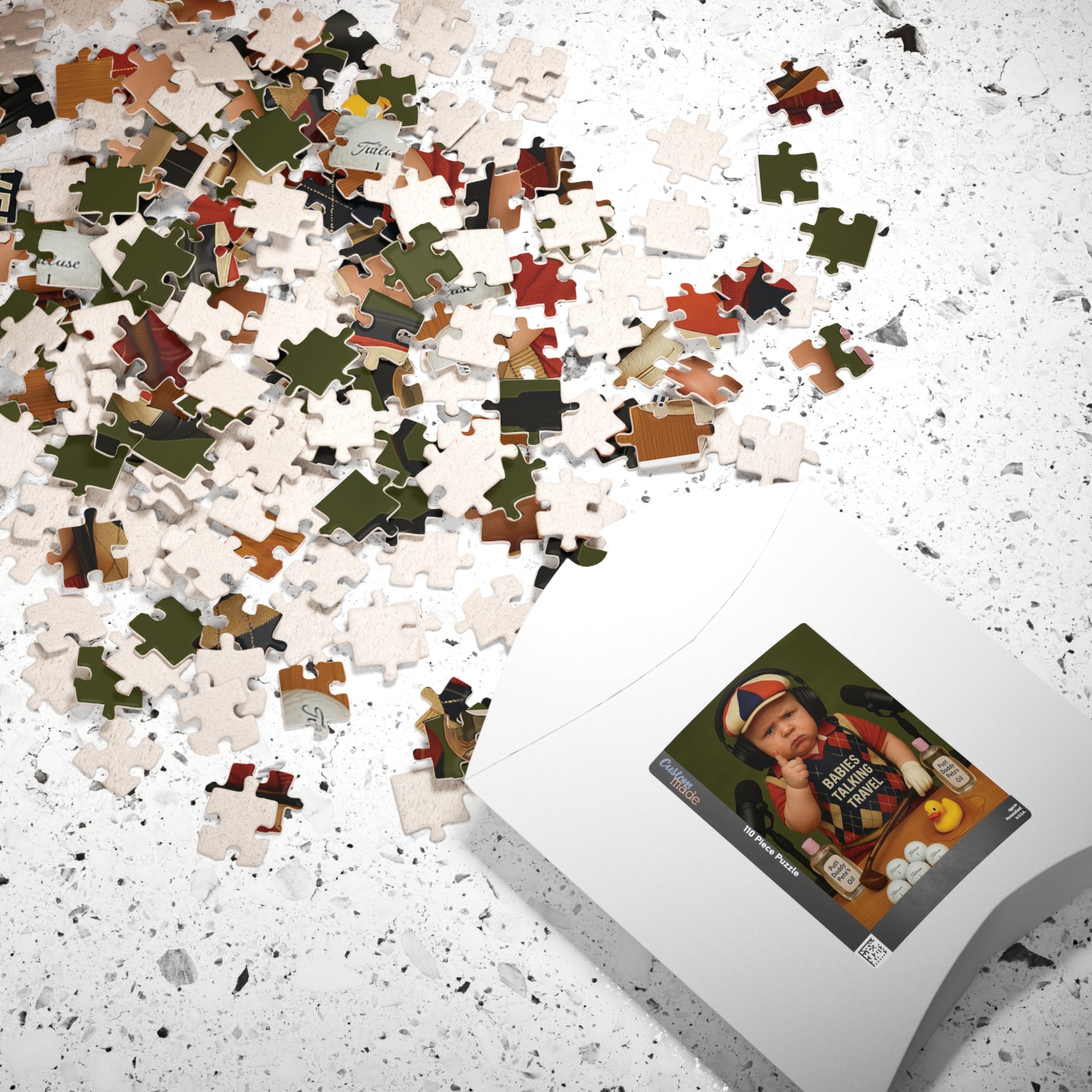 Get ready to giggle while you puzzle! The Babies Talking Travel 110-Piece Puzzle brings our outrageous Babies Charters crew straight to your coffee table. Each piece snaps together to reveal the baby podcasting chaos you know and love—complete with sippy cups, neon podcast signs, and travel shenanigans only Babies Talking Travel could dream up.